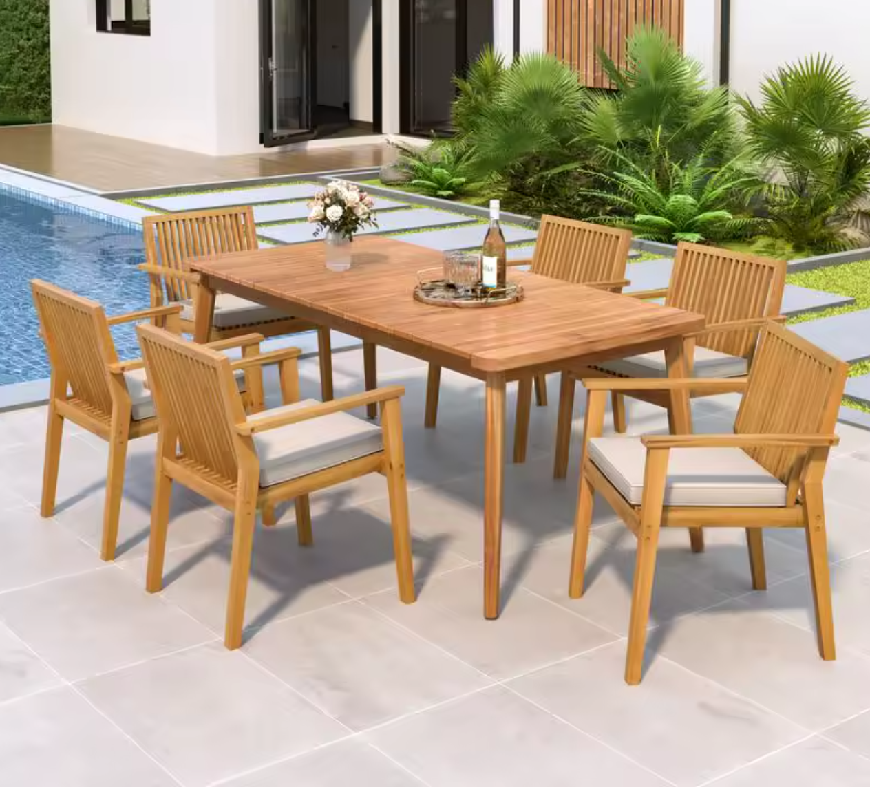 72″ Slatted Table & 6 Chairs with Cushions for Patio Garden Dining