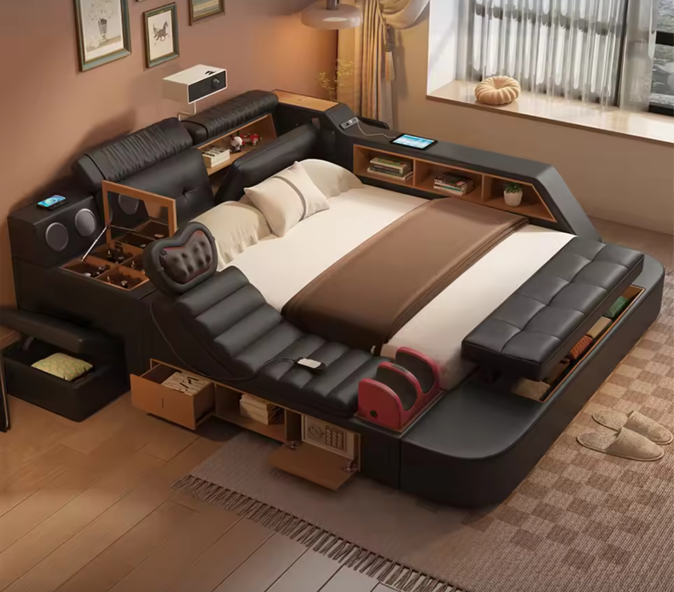 Multifunctional Bed with Massage Chair, Bluetooth Speakers, Projector, USB – Modern Upholstered King Size Bed